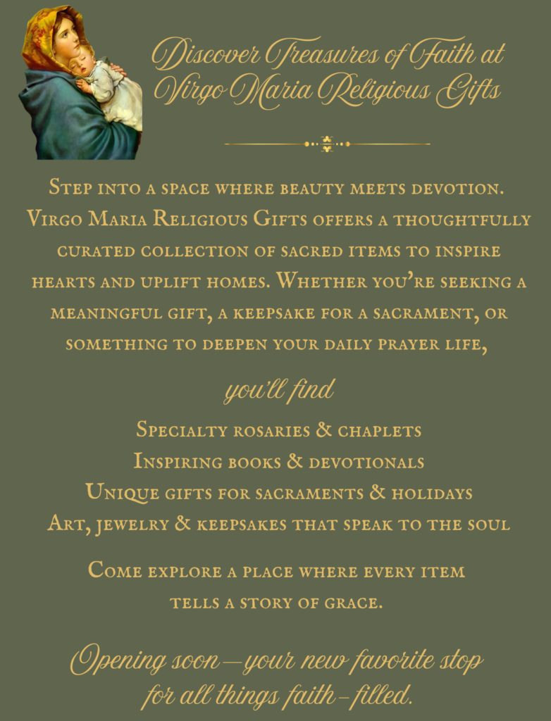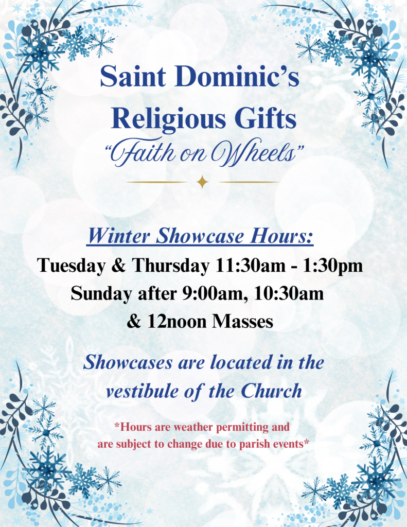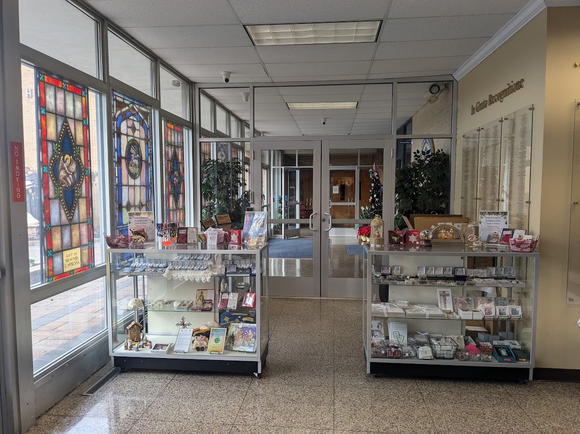 our church vestibule. Each week you'll find a thoughtful selection of beautiful religious devotionals such as Catholic literature, statues, Rosaries, jewelry, sacramental selections (for Baptism, Holy Communion & Confirmation - seasonal, & Matrimony).